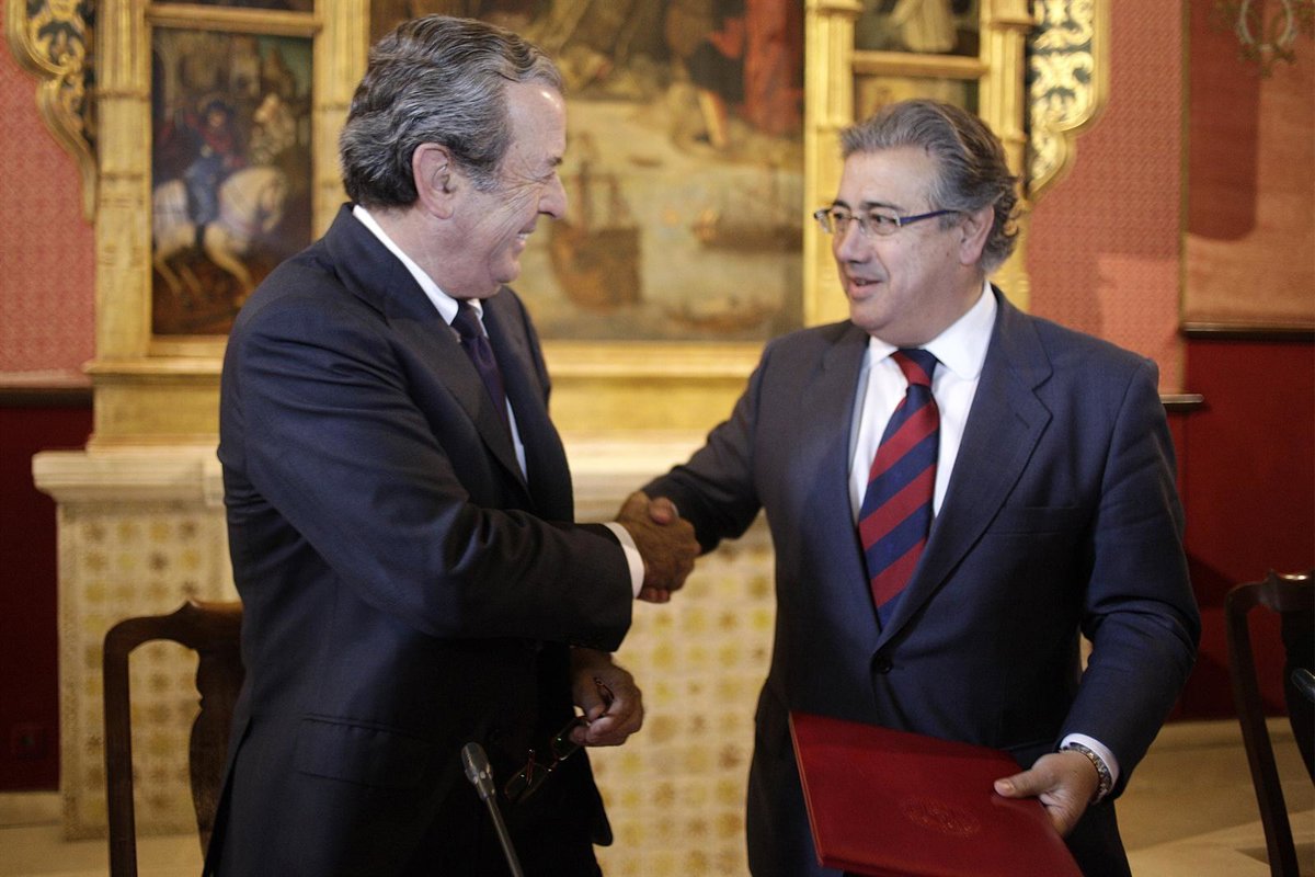 El alcalde de Sevilla, Juan Ignacio Zoido (PP), y el presidente de la Fundación Sevillana Endesa, Javier Benjumea, han firmado este viernes el acuerdo de colaboración para llevar a cabo la iluminación artística de la fachada del Patio de Banderas, del Palacio del Rey Don Pedro y del Patio de las Doncellas del Real Alcázar, una actuación que cuenta con una inversión de 290.000 euros por parte de la fundación y que estará finalizada en junio.