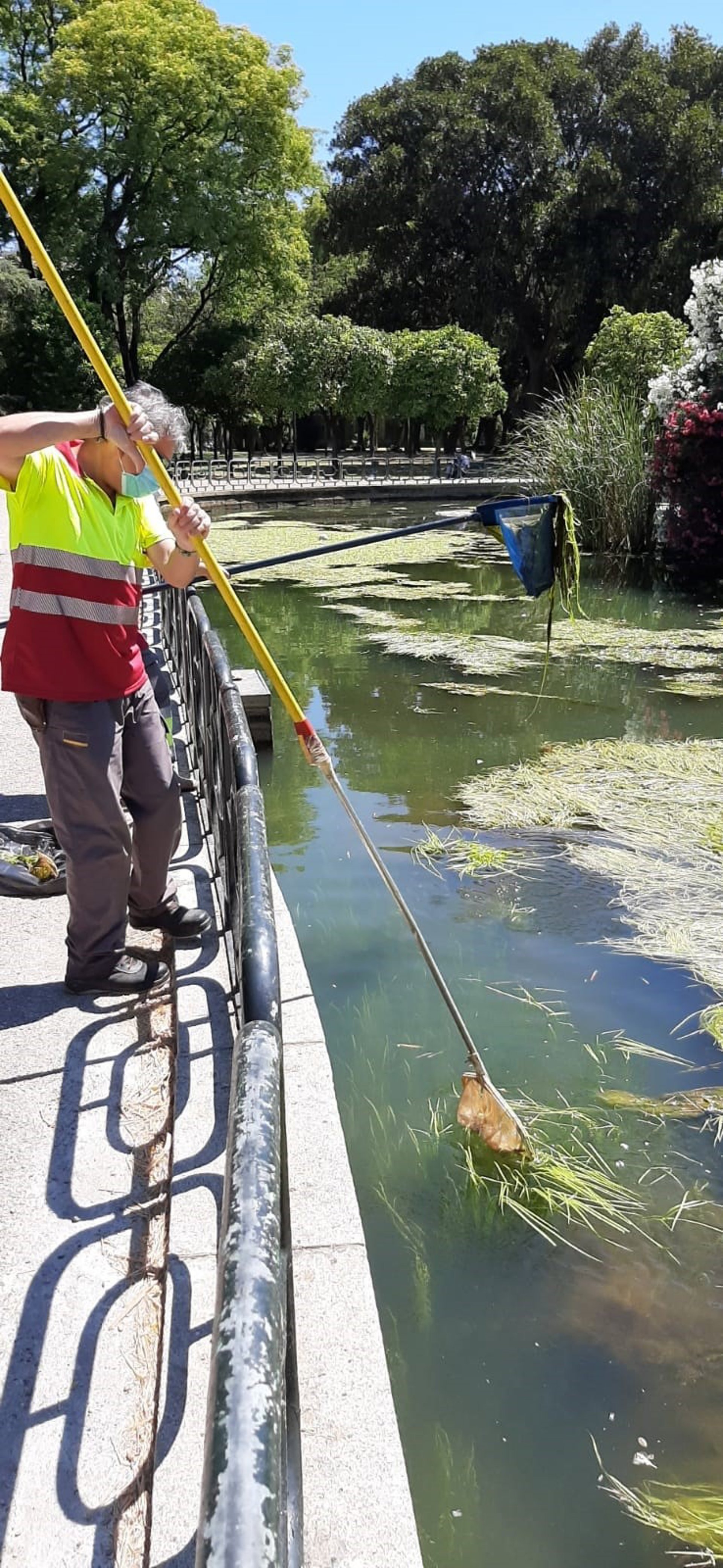 Además, las aves acuáticas contribuyen a la dispersión de sus propágulos, facilitando su colonización del estanque. Así, desde la tercera semana de junio se están realizando tareas de extracción de la biomasa y estudios para evaluar cómo atajarla sin dañar la diversidad biológica del estanque. "Estamos esperando a que los científicos acaben de tomar muestras para hacer una limpieza más profunda sin vaciar el estanque para evitar el estrés repetido para peces y anátidas".