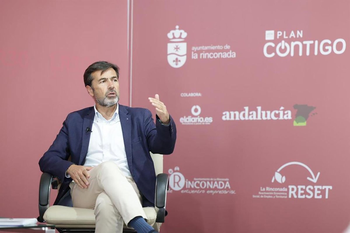 La Hacienda Santa Cruz ha acogido el encuentro con el director gerente del clúster empresarial Andalucía Aerospace, Juan Román Gallego, con el periodista Juan Carlos Blanco, en el marco del programa La Rinconada 20/30: LR30 Ideas para un mundo en transformación, que lleva a cabo el Ayuntamiento rinconero con la colaboración de elDiario.es Andalucía, con cargo al Plan Contigo de Diputación de Sevilla.
