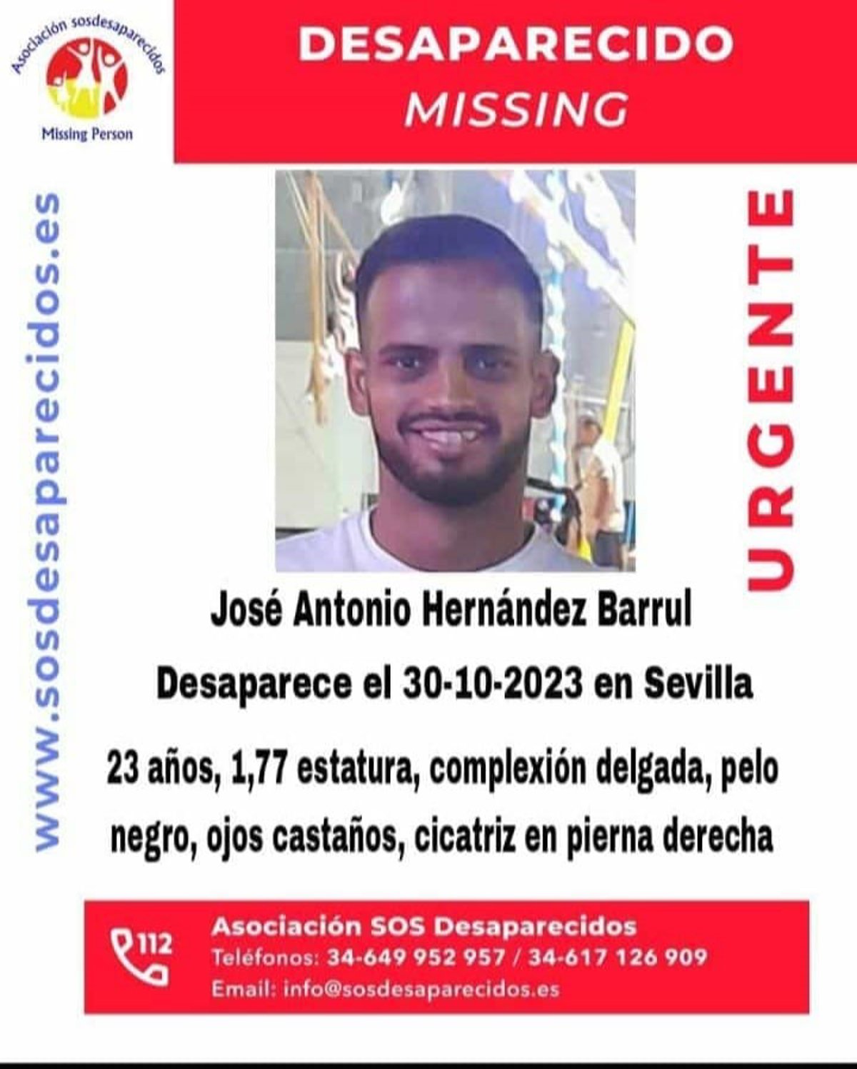 Se trata de José Antonio Hernández Barrul, un varón de 1,77 metros de altura, complexión delgada, pelo negro y ojos castaños que tiene como rasgo distintivo una cicatriz en la pierna derecha. Antes de su desaparición, habría abandonado su domicilio en el barrio hispalense de Torreblanca usando su bicicleta y sin llevar su documentación ni su teléfono móvil.