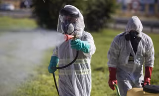 Archivo - Dos trabajadores durante las labores de fumigación contra los mosquitos causantes del virus del Nilo en Coria del Río - María José López - Europa Press - Archivo