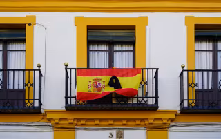 Banderas de España con crespones negros en algunos balcones de Sevilla a 13 de abril del 2020 - Eduardo Briones - Europa Press