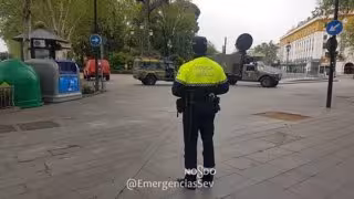 Un policía local de Sevilla en Puerta Jerez, ante varios vehículos de la UME - EMERGENCIAS SEVILLA
