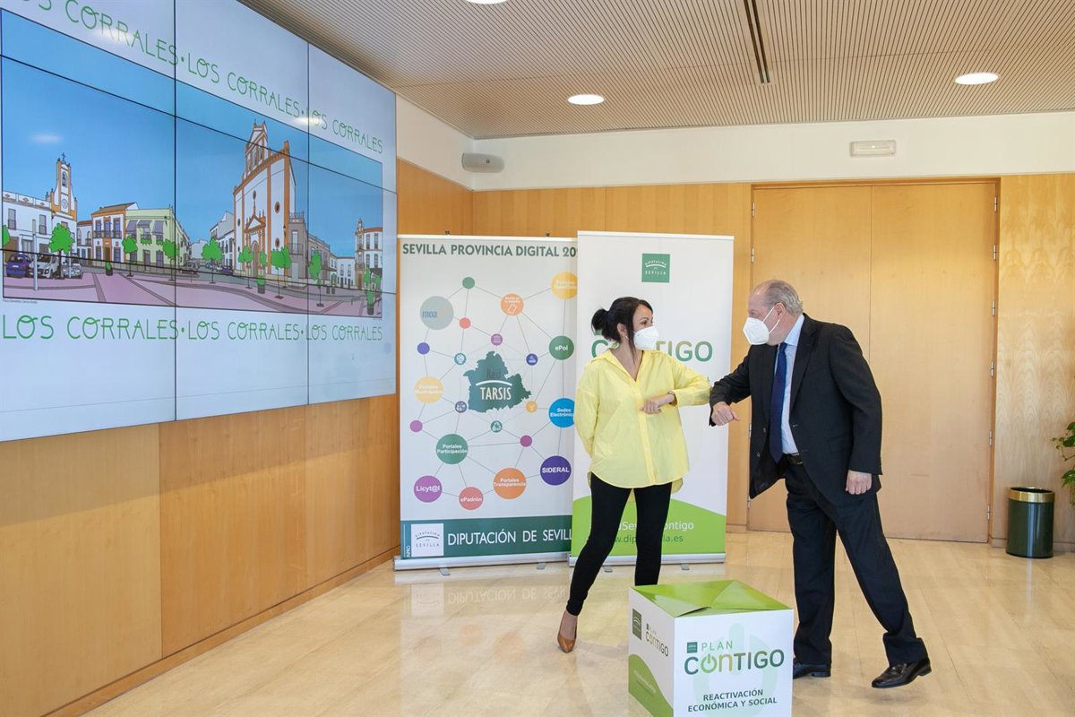 El presidente de la Diputación de Sevilla, Fernando Rodríguez Villalobos, y la alcaldesa de la localidad de Los Corrales, Buensuceso Morillo, han celebrado un encuentro en el que han abordado los principales proyectos que acometerá el Ayuntamiento mediante los fondos correspondientes al Plan Contigo y por el que tiene consignados una cuantía inicial de 946.890 euros, que se incrementarán alrededor de 260.000 euros gracias a la liquidación resultante del Presupuesto Provincial del 2020.