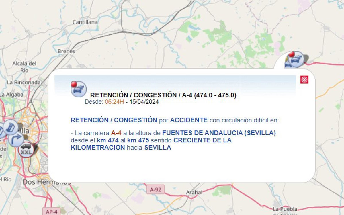 Según informa la Dirección General de Tráfico (DGT) en su página web, consultada por Europa Press, el corte afecta al carril en sentido Sevilla capital a la altura de kilómetro 475 de la A-4 y provoca tráfico lento en ambas direcciones.