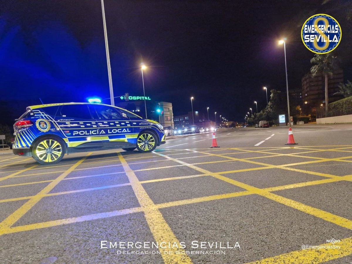 Vehículo de la Policía Local cortando el tráfico en la zona de la Ronda Urbana Norte donde un peatón ha sido atropellado mortalmente este domingo - TWITTER EMERGENCIAS SEVILLA