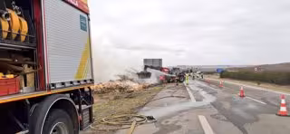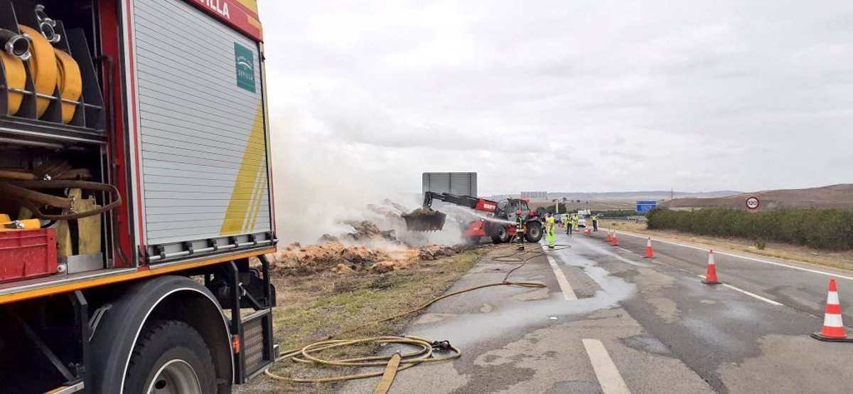 Un incendio en la carga de paja que transportaba un camión ha obligado este martes a cortar el tráfico en el carril derecho de la A-66 a la altura del término municipal de Guillena, en Sevilla.