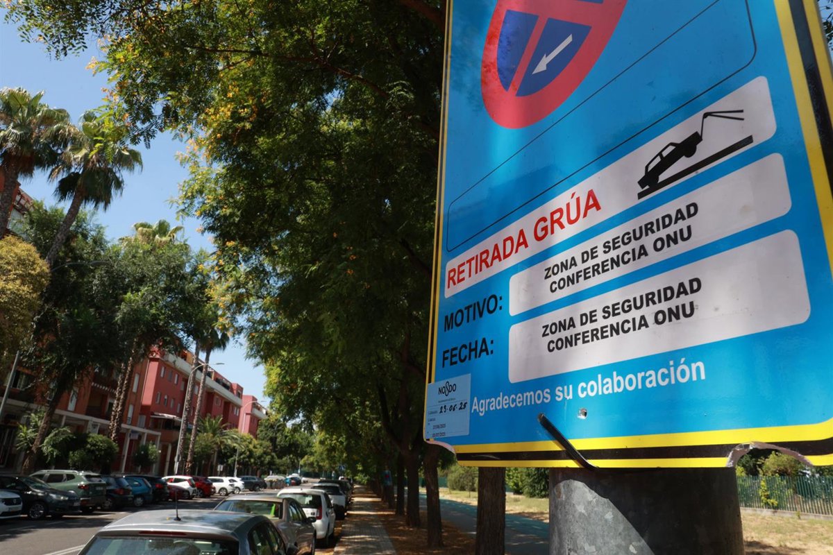Imagen de uno de los carteles en Sevilla Este informando de limitaciones por la cumbre de la ONU - ROCÍO RUZ/EUROPA PRESS