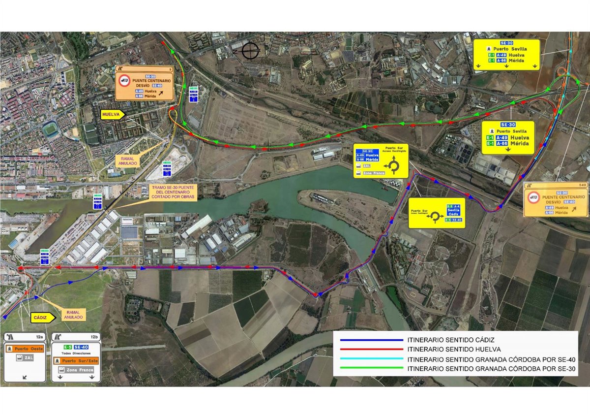 En el tráfico sentido Huelva, los vehículos procedentes de la A-4 se desviarán en la salida 549 (SE-30 Puente Centenario/SE-40/A-49 Huelva/A-66 Mérida) hacía la carretera de la esclusa (SE-31), continuando por la misma hasta la rotonda de la calle José Delgado Brackenbury, desde donde se podrá acceder a la SE-30.