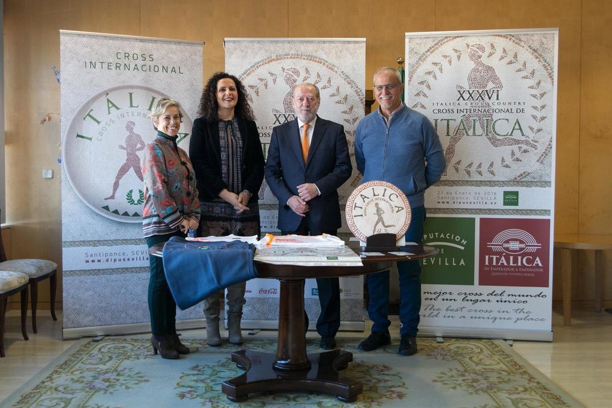 El presidente de la Diputación de Sevilla, Fernando Rodríguez Villalobos, se ha reunido este lunes con la diputada de Cultura y Ciudadanía, Rocío Sutil; la directora general del Área, Mercedes Méndez; y el director técnico del Cross Internacional de Itálica, José Manuel Díaz Chaves, para conocer de primera mano el material promocional que la organización tiene ya a punto para ofrecer este fin de semana a los atletas participantes y a los ganadores de las diversas competiciones que componen el evento poncino.