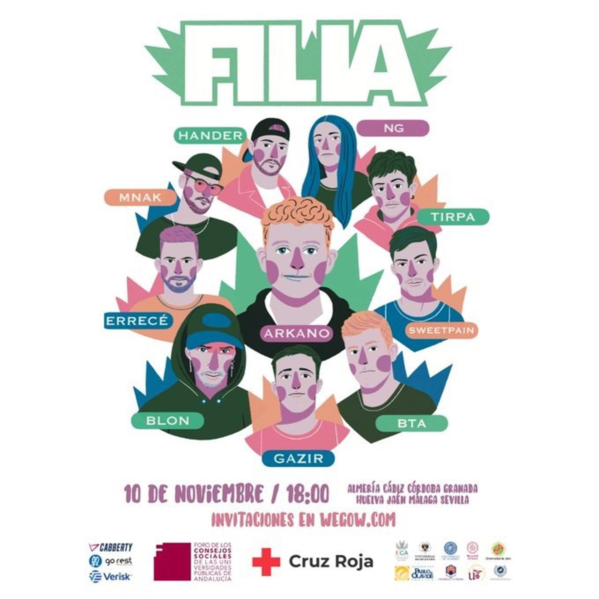 Cruz Roja Andalucía ha lanzado 'Filia', una iniciativa de sensibilización que se celebra simultáneamente en las ocho provincias de Andalucía el 10 de noviembre (18,00 horas). Con Arkano como embajador de la campaña en redes sociales, se hablará sobre Derechos Humanos en actos en nueve universidades públicas de Andalucía, entre ellas la de Sevilla y la Pablo de Olavide (UPO), de la mano de los 'freestylers' Blon, Mnak, Gazir, Tirpa, Sweetpain, NG, Errecé, Zasko y Hander.