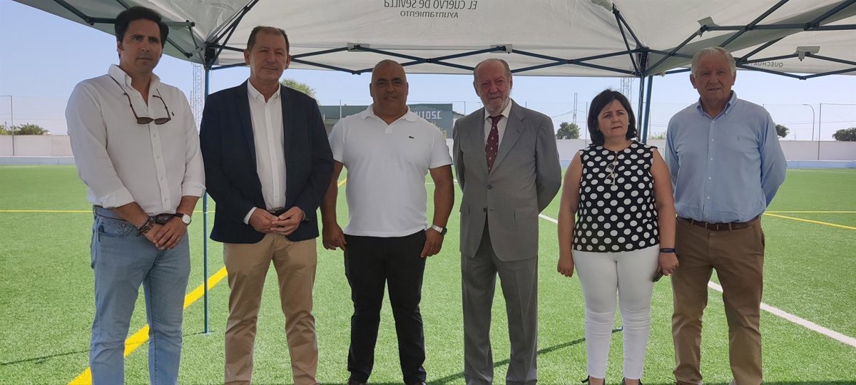 El presidente de la Diputación de Sevilla, Fernando Rodríguez Villalobos, ha visitado este jueves El Cuervo (Sevilla) con motivo de la sustitución del tapiz de su campo de fútbol municipal Andrés Villacieros, a través de las inversiones del Plan Contigo. El proyecto asciende a un total de 230.000 euros y está encuadrado en el programa de Cooperación en Inversiones y Servicios.
