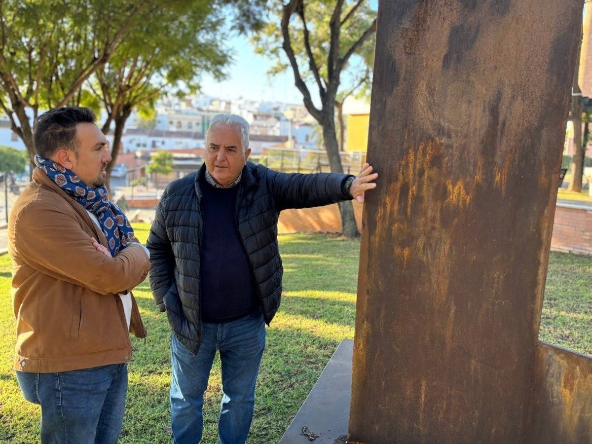 La escultura del Árbol de Rafael Cerdá luce ya su estado original en el Parque Centro de Alcalá de Guadaíra (Sevilla) tras los trabajos de limpieza y restauración a los que ha sido sometida, tal y como ha explicado el delegado municipal de Cultura, Patrimonio y Museo, Christopher Rivas, en una visita realizada junto con el autor de la obra.