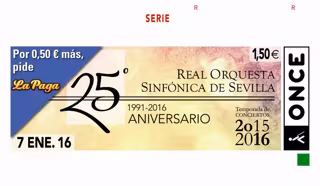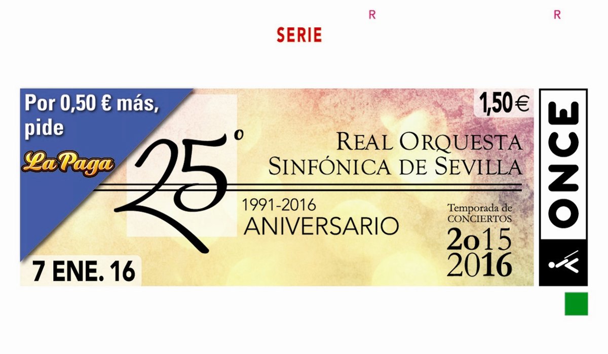 Con este cupón, la ONCE se ha sumado a la celebración de los 25 años de vida de la Real Orquesta Sinfónica de Sevilla. En la presentación en sociedad de este cupón, el delegado territorial de la ONCE en Andalucía, Ceuta y Melilla, Cristóbal Martínez, consideró "todo un orgullo" que la ONCE comenzara el año de la mano de "una de las mejores orquestas de Europa" que cuenta con John Axelrod como director artístico, "uno de los directores de mayor prestigio internacional del escenario musical". A su juicio, tanto el teatro de la Maestranza como la ROSS constituyen "uno de los referentes principales de la cultura en Andalucía". Martínez dijo que los cinco millones y medio de cupones que han proyectado la imagen de este 25 aniversario son "una ovación masiva de cinco millones y medio de aplausos a quienes han formado parte de la trayectoria de éxitos de la orquesta" y un reconocimiento a su calidad artística y su contribución "a la felicidad de la ciudad de Sevilla".