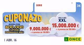 El nuevo Cuponazo de la ONCE ofrece todos los viernes, por tres euros, un premio a las cinco cifras más serie de nueve millones de euros, y seis segundos premios de 100.000 euros a otras tantas extracciones, también con serie. Si se opta por el Cuponazo XXL, por cinco euros, el premio sube a 15 millones y 200.000 euros, respectivamente.