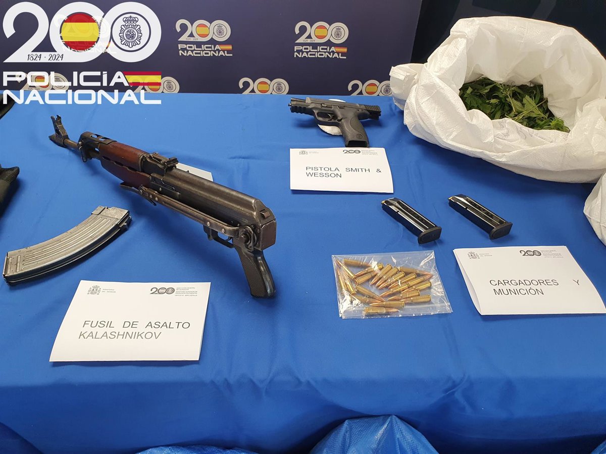 En los registros efectuados, autorizados con carácter urgente, los agentes han intervenido un total de 1.200 plantas de marihuana en diferentes fases de crecimiento, que una vez desbrozadas arrojaron un peso de casi 70 kilogramos; así como un fusil de asalto Kalashnikov AK-47 municionado y listo para su uso, una pistola también municionada y con el cargador de repuesto, 49 cartuchos de fusil de guerra, 29 cartuchos de arma corta, dos chalecos antibalas y guantes de corte, todo ello oculto en una de las viviendas configurada como "un auténtico búnker", según la Policía Nacional.