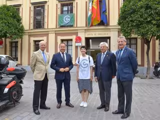El delegado del Gobierno de la Junta de Andalucía en Sevilla, Ricardo Sánchez, ha recibido este jueves en la Delegación de la Junta en Sevilla la bandera contra el cáncer de manos del presidente provincial de la Asociación Española Contra el Cáncer (AECC), Jesús Maza. Ambos han presidido junto al presidente de la Cámara de Comercio, Francisco Herrero, el acto de colocación de la bandera en la sede de la Delegación con la que sumarse a la labor de concienciación que hace la entidad.