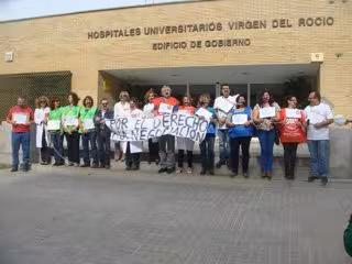 Delegados de varios sindicatos se han concentrado este jueves sobre las 12,00 horas a las puertas del Edificio de Gobernación del Hospital Virgen del Rocío de Sevilla, donde han permanecido por espacio de una hora por la forma en la que se está aplicando la ampliación de las jornadas de trabajo a las 37,5 horas.