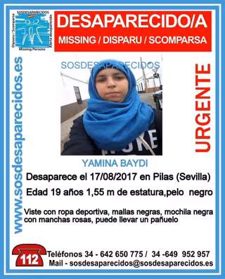 En su edición de este domingo, 'El Correo de Andalucía' ha concretado que se trata de Yasmina Baydi, una joven que mide 1,55 metros y tiene el pelo negro, y que en el momento de su desaparición vestía con ropa negra, mallas negras, mochila negra con manchas rosas y podría llevar pañuelo en el pelo.
