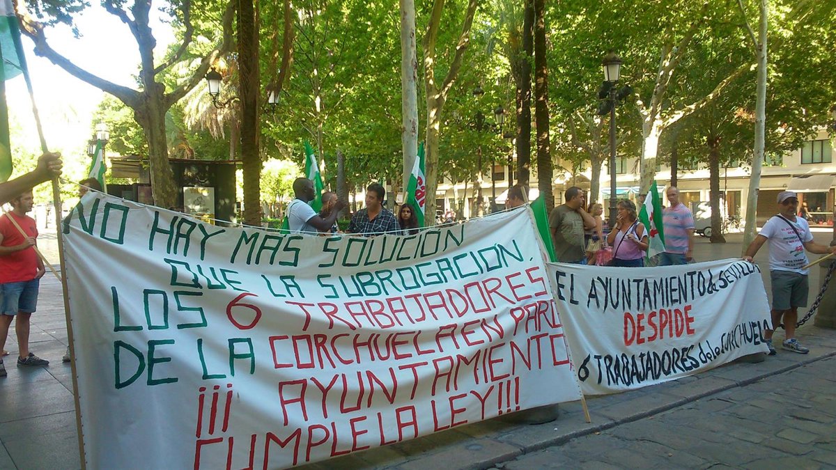 Después de que la empresa adjudicataria del nuevo contrato, "una filial" de Bormujardín XXI, subrogase sólo a este único empleado, los seis restantes han caído en el desempleo, por lo que celebran cada día una protesta a las puertas del Ayuntamiento, principal propietario del parque, para reclamar una solución.