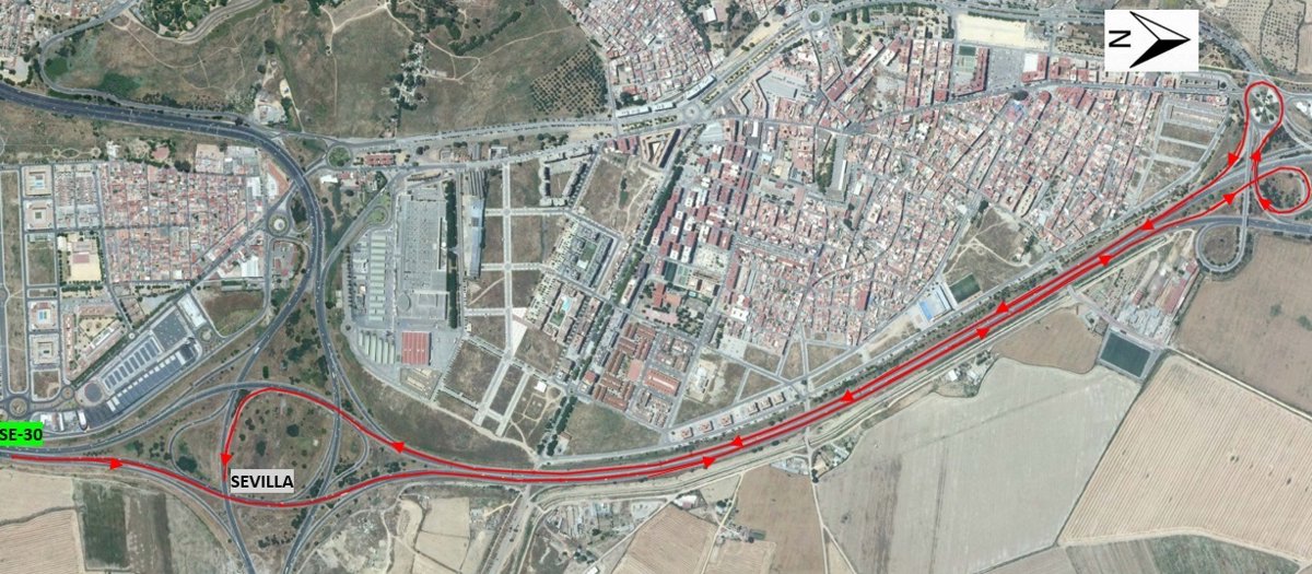 La noche del 8 de mayo se procederá al corte del tráfico en los ramales Cádiz-Sevilla y Sevilla Mérida y en los carriles central y derecho de la SE-30 Sevilla -Mérida (p.k.17+000). La autovía SE-30 estará abierta al tráfico por el carril izquierdo y se recomiendan varios itinerarios alternativos para los Ramales Cádiz-Sevilla y Sevilla-Mérida.