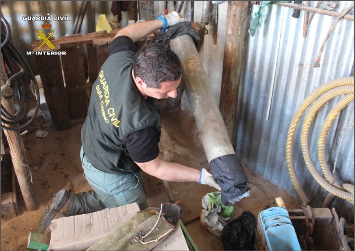 Por otra parte, los agentes localizaron un machete ensangrentado atado con un palo largo a modo de lanza casera; cinco lazos de latón y dos rollos de dicho alambre para la fabricación de estos; un recipiente con una sustancia granulada oscura, posiblemente veneno, y una escopeta de caza oculta bajo un palé de madera sin documentación alguna.