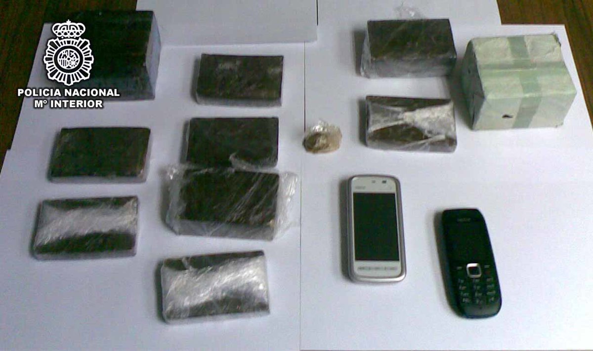 En este momento, el nerviosismo de estos dos individuos se agudizó por lo que fueron cacheados y revisadas sus maletas, hallando en su interior un total de diez fichas, con forma rectangular y de diferentes tamaños, de una sustancia marrón que resultó ser hachís y de un peso bruto superior a los dos kilogramos. Fueron detenidos por un delito contra la salud pública y ya han sido puestos a disposición judicial.