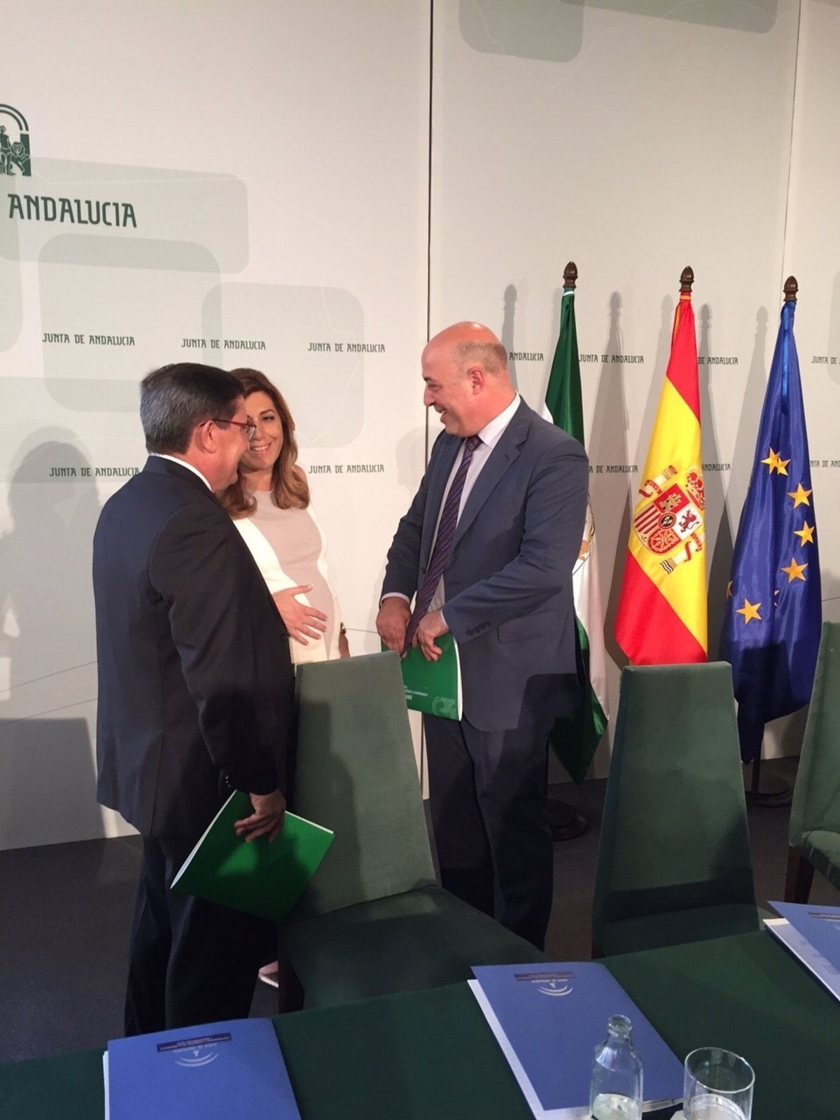 El acto de firma del convenio por Antonio Ruiz ha tenido lugar en el Palacio de San Telmo en Sevilla, junto al resto de presidentes de las diputaciones andaluzas, y ha contado con la presencia de la presidenta de la Junta de Andalucía, Susana Díaz.