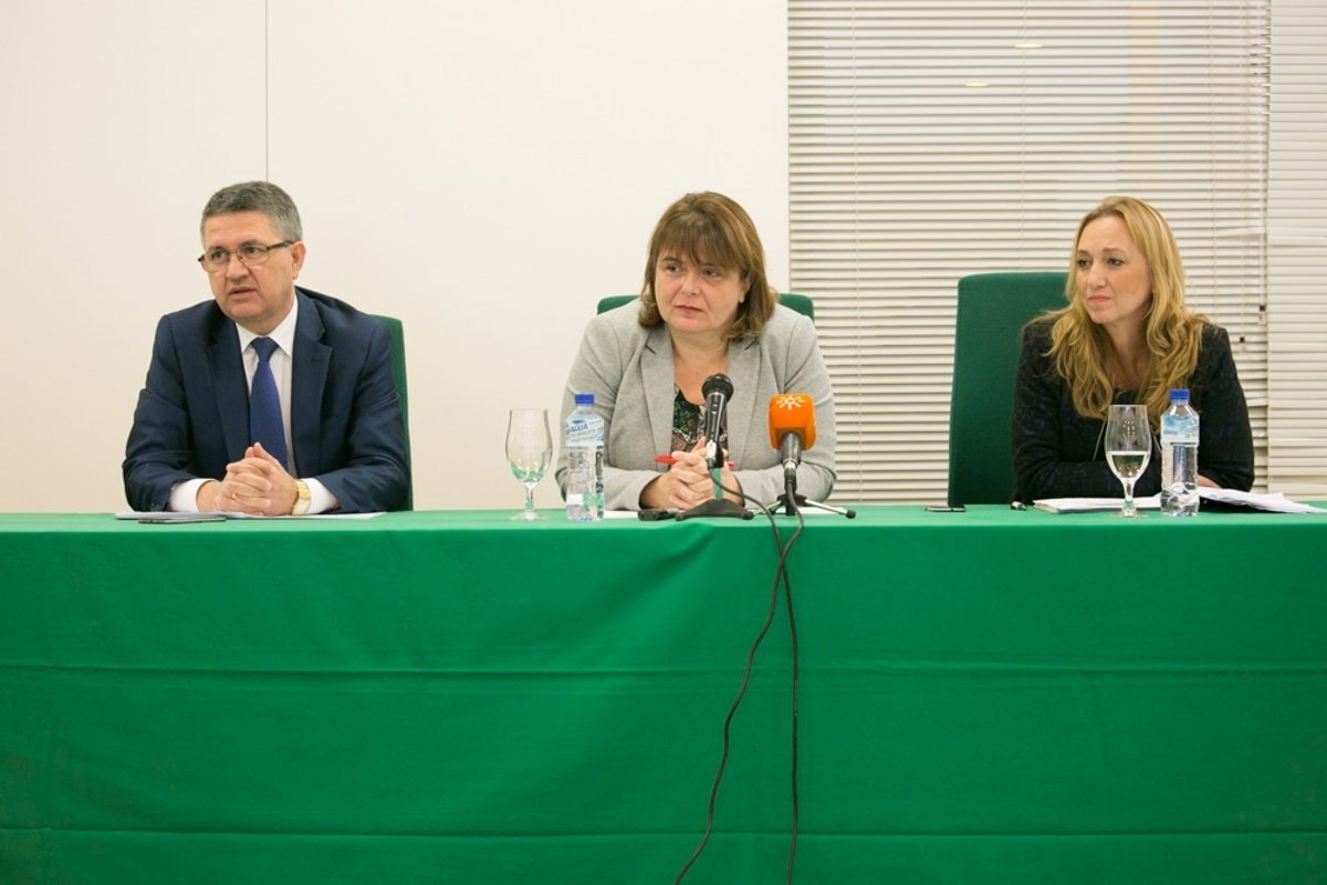 La portavoz del Equipo de Gobierno de la Diputación de Sevilla, Trinidad Argota, acompañada por los diputados de Hacienda y de Empleado Público, Concepción Ufano y Mario Martínez, respectivamente, daban cuenta en rueda de prensa del contenido del pleno extraordinario que celebrará la institución este lunes.