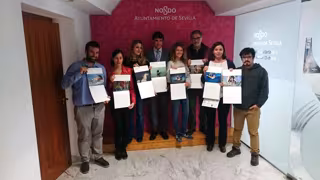 El delegado de Deportes del Ayuntamiento de Sevilla, David Guevara, junto con representantes de la Asociación Autismo Sevilla, y algunos de los fotógrafos sevillanos participantes en este proyecto han presentado la edición 2017 del tradicional calendario de esta asociación que en esta ocasión ha elegido el deporte como hilo conductor y ejemplo de la integración de quienes conviven con este diagnóstico.