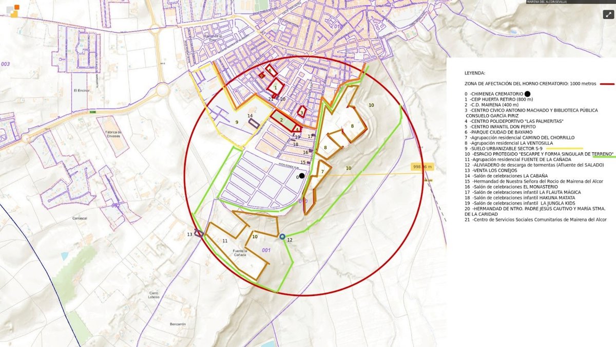 Plano de ubicación y área de influencia del horno crematorio proyectado en Mairena del Alcor, en Sevilla. - ECOLOGISTAS EN ACCION