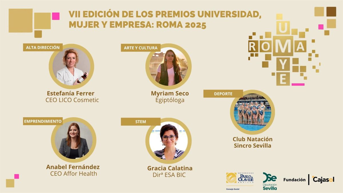 El Consejo Social de la Universidad Pablo de Olavide (UPO) ha convocado los 'VII Premios Universidad, Mujer y Empresa: ROMA', que reconoce a las empresarias Estefanía Ferrer y Anabel Fernández, la egiptóloga Myriam Seco, la ingeniera de Telecomunicación Gracia Catalina y el Club Natación Sincro Sevilla por su "talento, innovación, emprendimiento, liderazgo e inspiración".