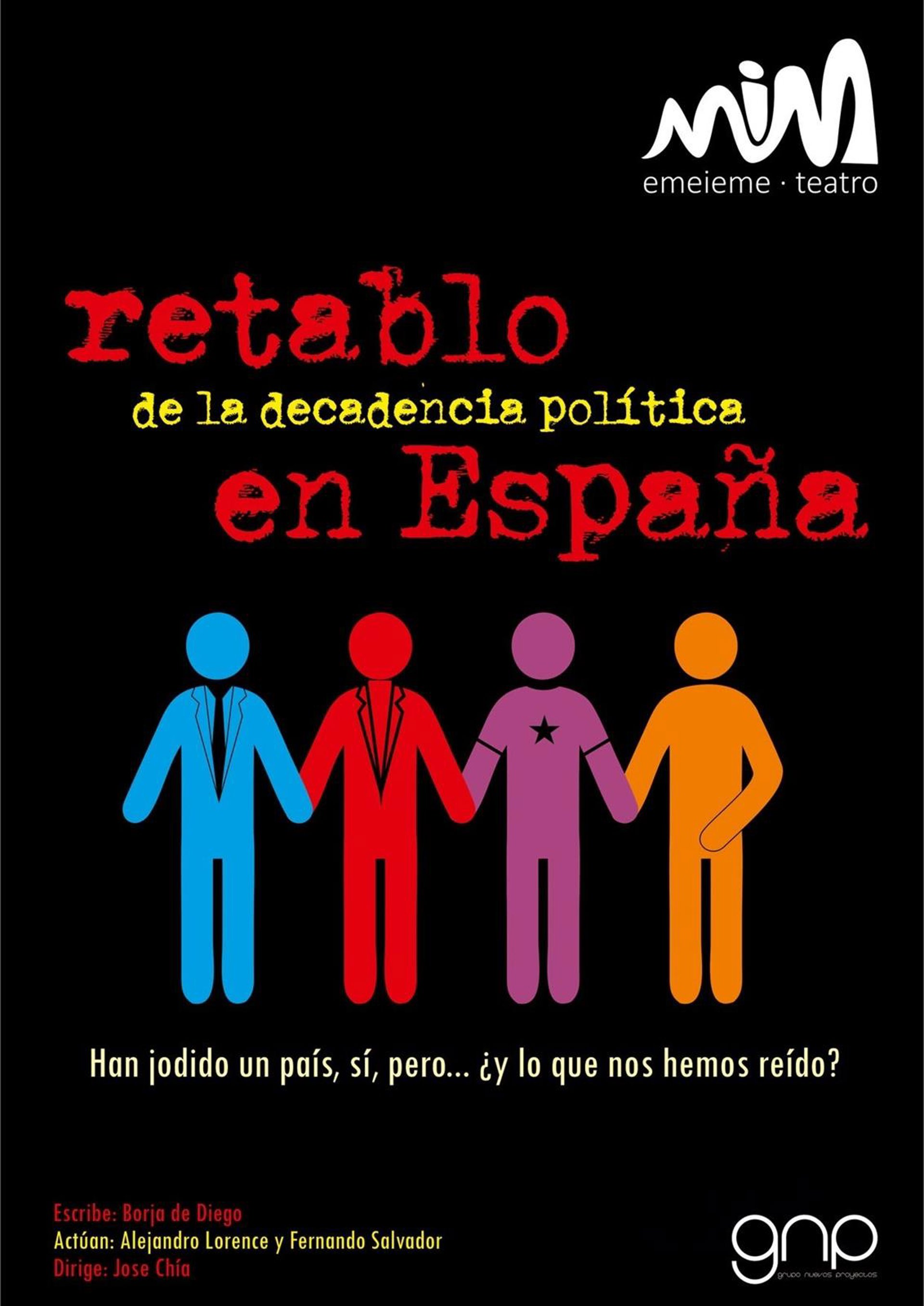 El proyecto EmeiEme Teatro echa a andar con el estreno de su primer montaje, 'Retablo de la decadencia política en España'. Esta sátira política del joven creador dramático Borja de Diego propone a partir de un humor ácido reírse de lo absurdo, surrealista y por momentos bufonesco de la política española. El estreno, bajo la dirección de José Chía, recibe el apoyo promocional de la Sociedad General de Autores y Editores (SGAE).