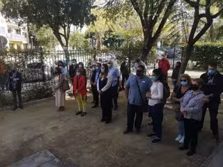 Los aledaños de la sede del distrito Sur del Ayuntamiento de Sevilla han acogido este lunes un acto con un minuto de silencio, en memoria del trabajador de dichas instalaciones fallecido recientemente víctima de la pandemia de coronavirus Covid-19, contando con la asistencia de la plantilla de dicho centro, antiguos compañeros de trabajo del difunto y vecinos del barrio.