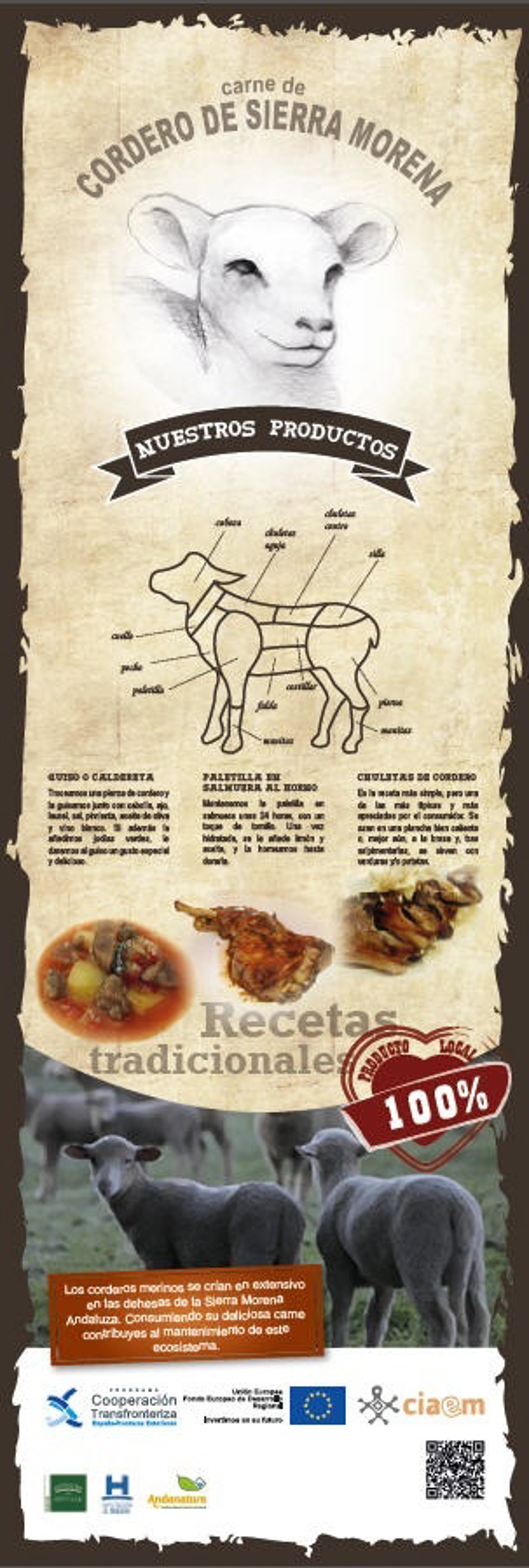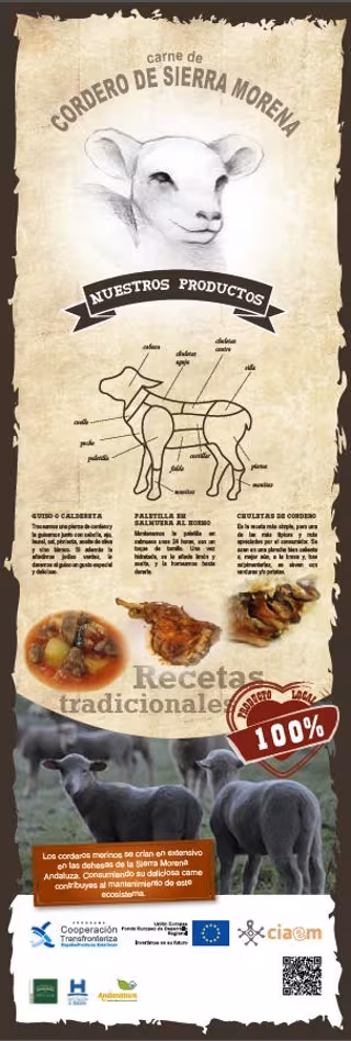 Los corderos merinos, cuya carne constituye una de las bases de la gastronomía andaluza, con platos tan típicos como las chuletas de cordero, la paletilla al horno, y el cordero a la miel, se crían en extensivo en las dehesas de la Sierra Morena Andaluza. Al consumir su carne en cualquiera de sus variedades contribuimos al mantenimiento de este ecosistema natural, y a la economía de la zona.