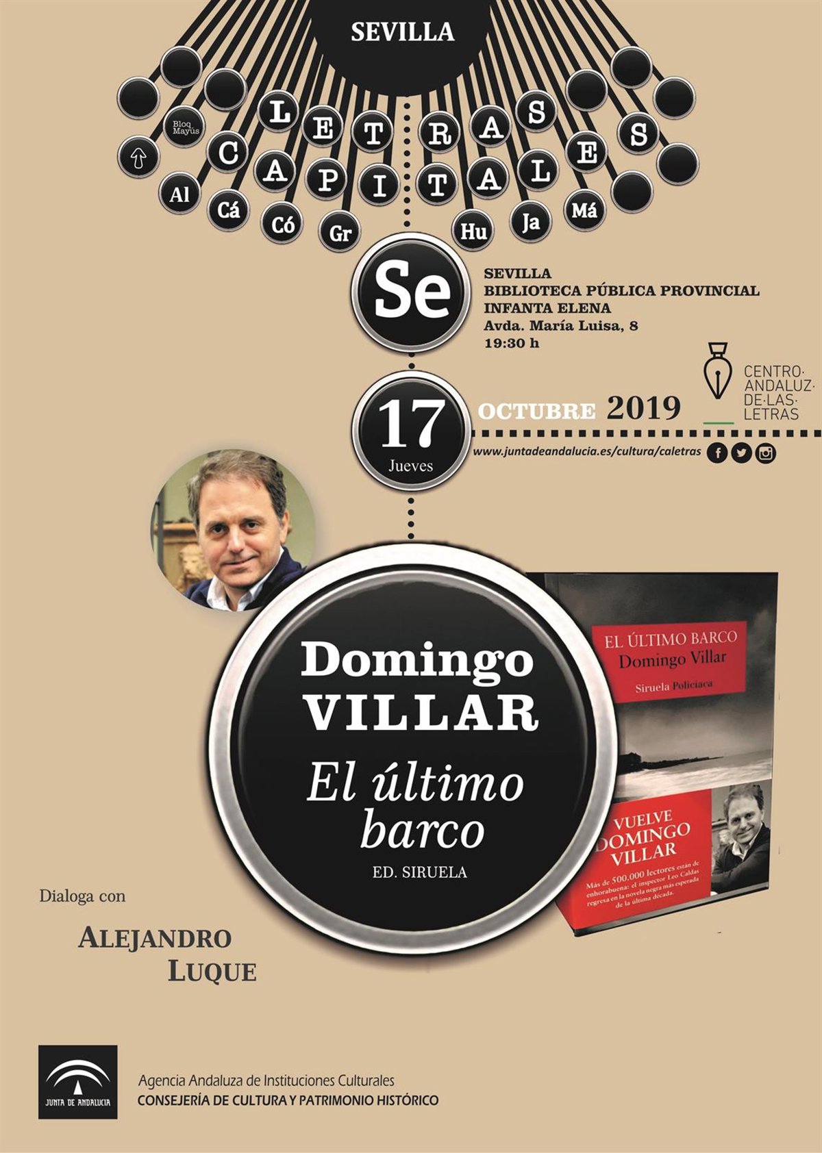 La Consejería de Cultura y Patrimonio Histórico, a través del Centro Andaluz de las Letras (CAL), organiza este jueves, 17 de octubre, en Sevilla la presentación de la nueva novela del escritor Domingo Villar, 'El último barco', publicado por la editorial Siruela. El encuentro literario, que tendrá lugar en la Biblioteca Infanta Elena a las 19,30, consistirá en un diálogo con el periodistas y escritor Alejandro Luque sobre la nuevo caso del Inspector Leo Caldas.