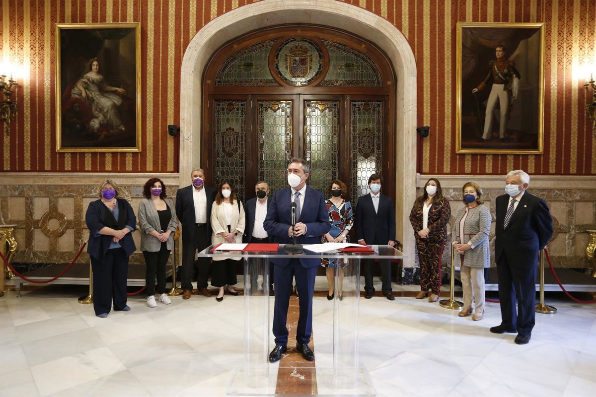El regidor ha firmado estos convenios nominativos, por un importe de 60.000 euros, con el presidente de la CES, Miguel Rus; el presidente de la Cámara de Comercio, Francisco Herrero; el secretario general de CCOO Sevilla, Alfonso Vidán, y su homólogo en UGT Sevilla, Juan Bautista Ginés, en un acto al que también han asistido la delegada de Igualdad, Participación Ciudadana, Educación y Coordinación de Distritos, Adela Castaño, y la delegada de Recursos Humanos y Modernización, Clara Macías.