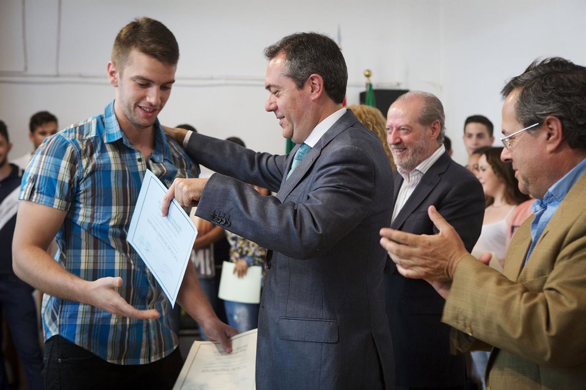El alcalde de Sevilla, Juan Espadas; el presidente en funciones de la Diputación, Fernando Rodríguez Villalobos; y el delegado territorial en funciones de la Consejería de Educación de la Junta de Andalucía, Francisco Díaz Morillo; han presidido este viernes la ceremonia de graduación de 25 alumnos que han finalizado la ESO en el IES Siglo XXI de Torreblanca.