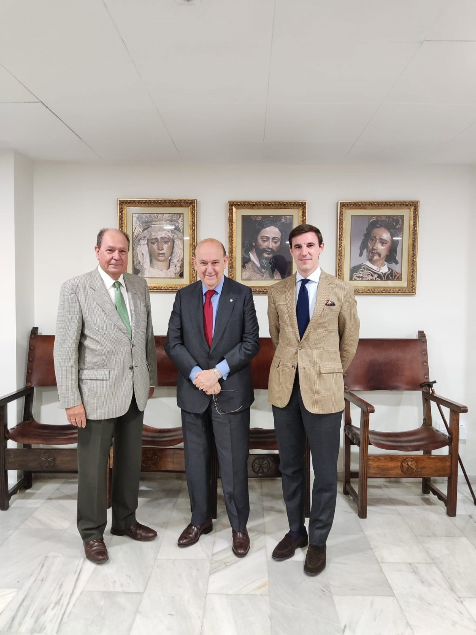 Andrés Ollero flanqueado por Nicolás Ollero, hermano mayor de la hermandad, y Pablo Murillo, diputado de formación - FELIPE BENIGNO
