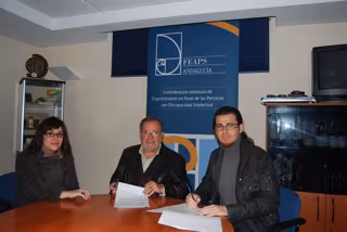 El presidente de la Confederación Española de Organizaciones en favor de las Personas con Discapacidad Intelectual (Feaps) en Andalucía, Juan Manuel Carrasco, y el editor, Antonio García Villarán, en representación de Cangrejo Pistolero Ediciones, han firmado este martes en Sevilla un convenio de colaboración para la publicación de obras de poesía o de ámbito cultural, cuyos autores sean personas con discapacidad intelectual.