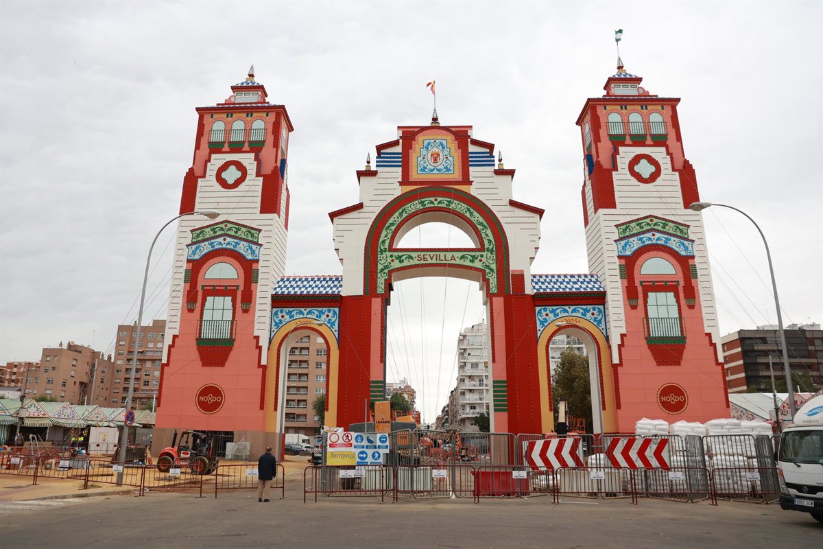 Varios trabajadores ultiman las tareas de montaje de la portada de la Feria de Sevilla. - Rocío Ruz - Europa Press