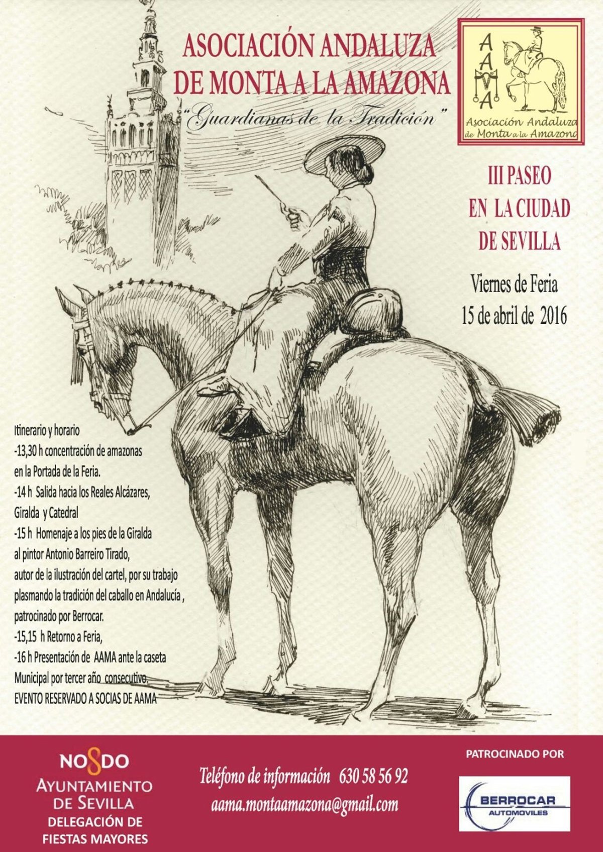 Junto al monumento más emblemático de la ciudad, Automóviles la empresa Berrocar hará un reconocimiento a las Amazonas y a la labor que realizan y les ofrecerá una copa de vino español. El acto será también un afectuoso homenaje hacia el difunto Antonio Barreiro Tirado, autor del grabado que ilustra el Cartel del III Paseo de Amazonas de la Feria de Sevilla.
