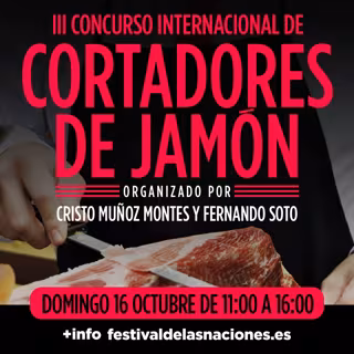 El Festival de las Naciones acoge este domingo el III Concurso Amateur de Cortadores de Jamón al que se presentarán cortadores aficionados de Sevilla, Huelva y Almería. Organizado por el maestro cortador Cristo Muñoz Montes, que actualmente ostenta cuatro récords Guinness, y Fernando Soto, cortador de jamón profesional y jurado en los concursos nacionales más prestigiosos, se desarrollará de 11,00 a 16,00 horas en la zona central del recinto.