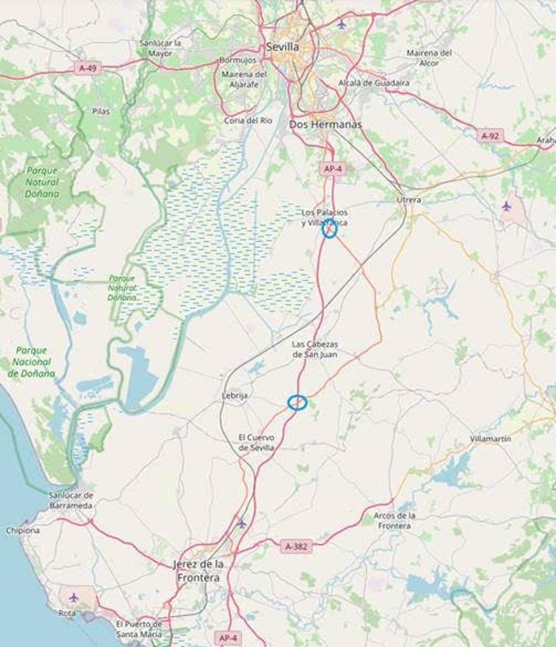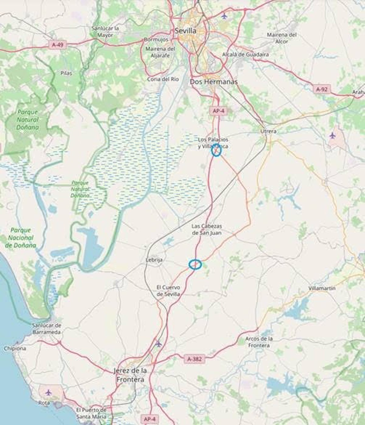 Trazado de la AP-4 y la N-4, entre Sevilla y Cádiz - MITMA