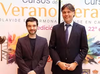 El ministro de Derechos Sociales, Consumo y Agenda 2023, Pablo Bustinduy y el rector de la Universidad Pablo de Olavide (UPO), Francisco Oliva, en los cursos de verano de la UPO en Carmona (Sevilla). - UPO