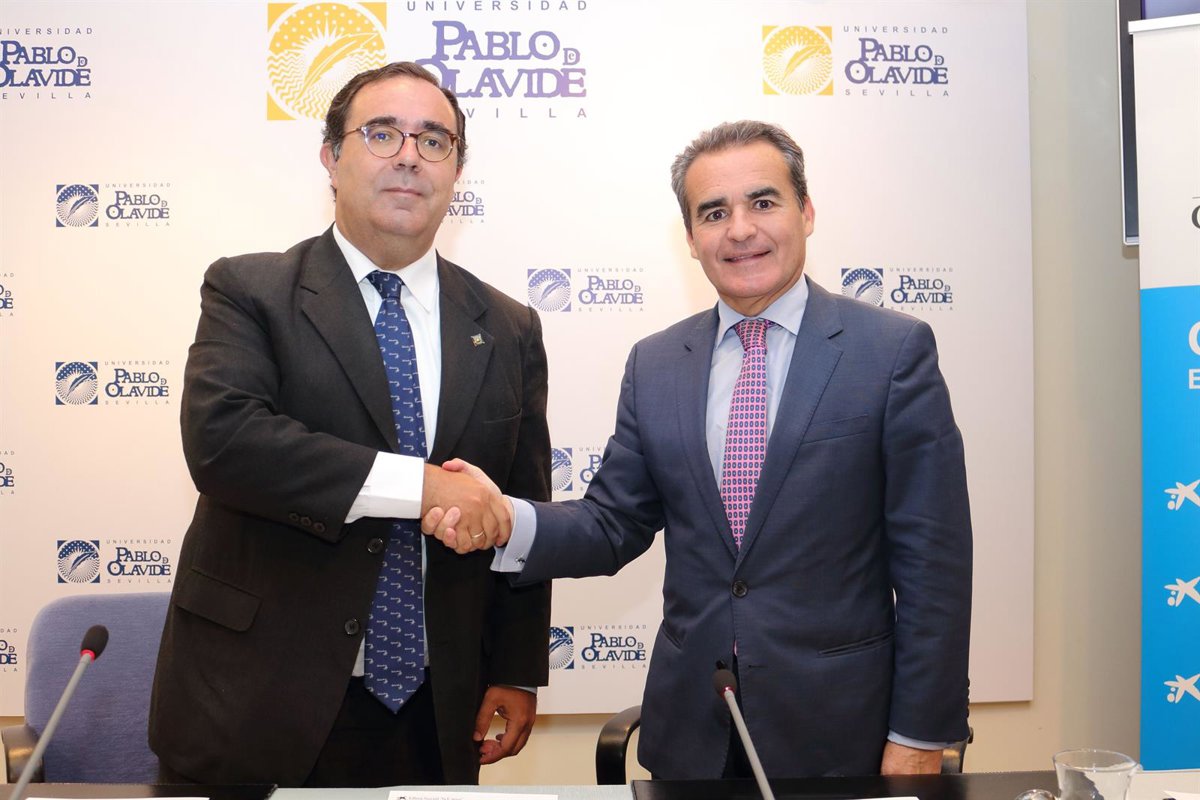 El rector de la Universidad Pablo de Olavide, Vicente Guzmán Fluja, y el director territorial de CaixaBank en Andalucía Occidental, Rafael Herrador, han presidido este lunes el acto de entrega de la donación por parte de la Fundación La Caixa, en virtud del convenio suscrito entre ambas entidades, para el desarrollo del programa Aula Abierta de Mayores de la UPO en presencia de representantes de los 19 municipios que participan en el mismo y que este curso cuenta con 843 alumnos.