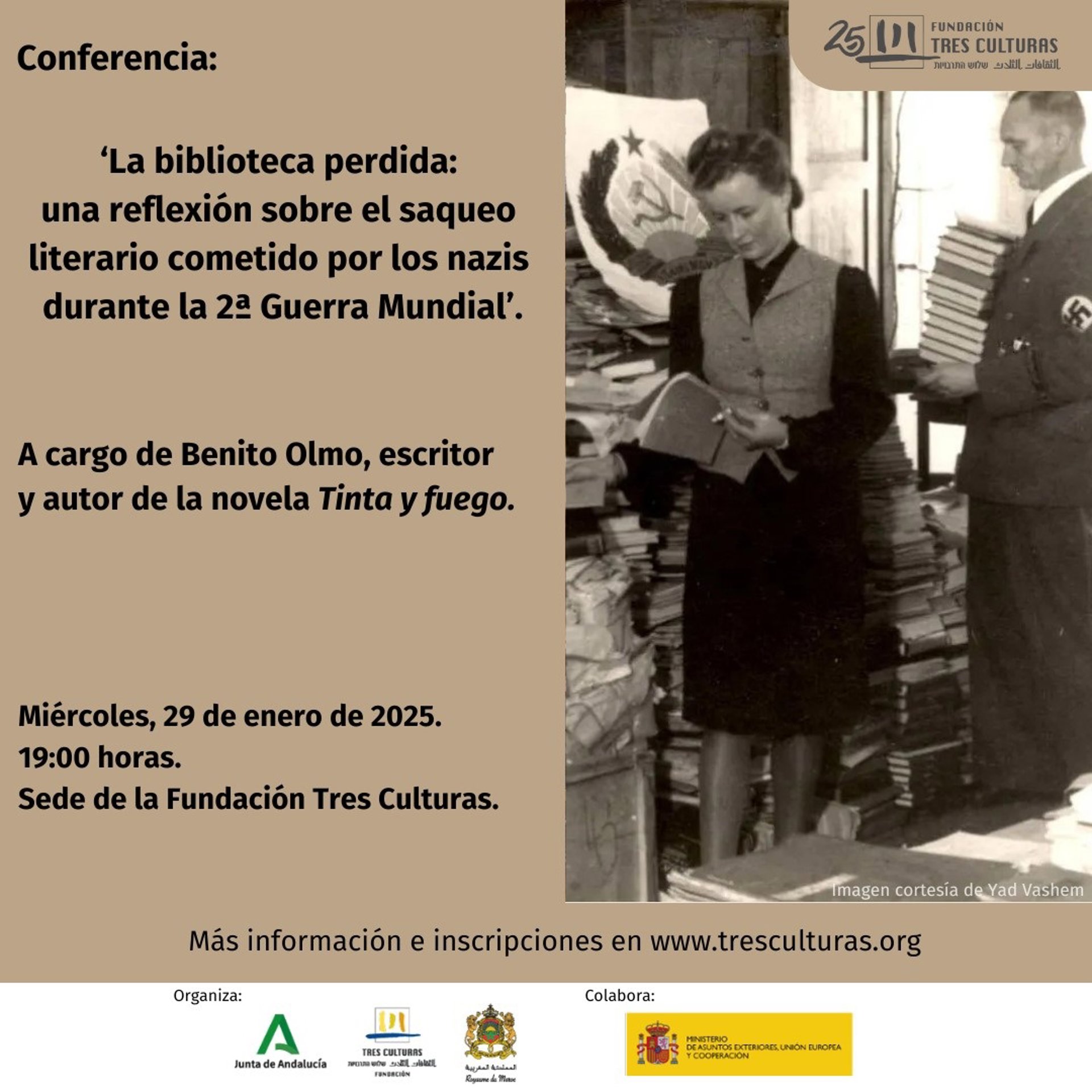 Coincidiendo con la conmemoración del Día Oficial de la Memoria del Holocausto y la Prevención de los Crímenes Contra la Humanidad, celebrado el pasado lunes, la Fundación Tres Culturas ofrece este miércoles a las 19,00 horas en Sevilla, la conferencia 'La biblioteca perdida: una reflexión sobre el saqueo literario cometido por los nazis durante la Segunda Guerra Mundial' a cargo del escritor Benito Olmo.
