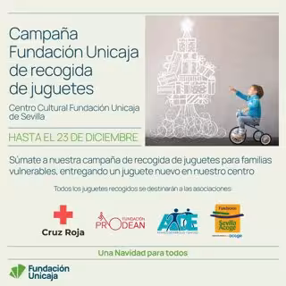 Fundación Unicaja ha anunciado este miércoles que ha puesto en marcha una campaña de recogida de juguetes nuevos destinada a menores de familias vulnerables atendidas por Cruz Roja, Avance Desarrollo y Empleo, Fundación Prodean y Fundación Sevilla Acoge. La iniciativa se desarrollará hasta el 23 de diciembre en el Centro Cultural Fundación Unicaja de Sevilla.