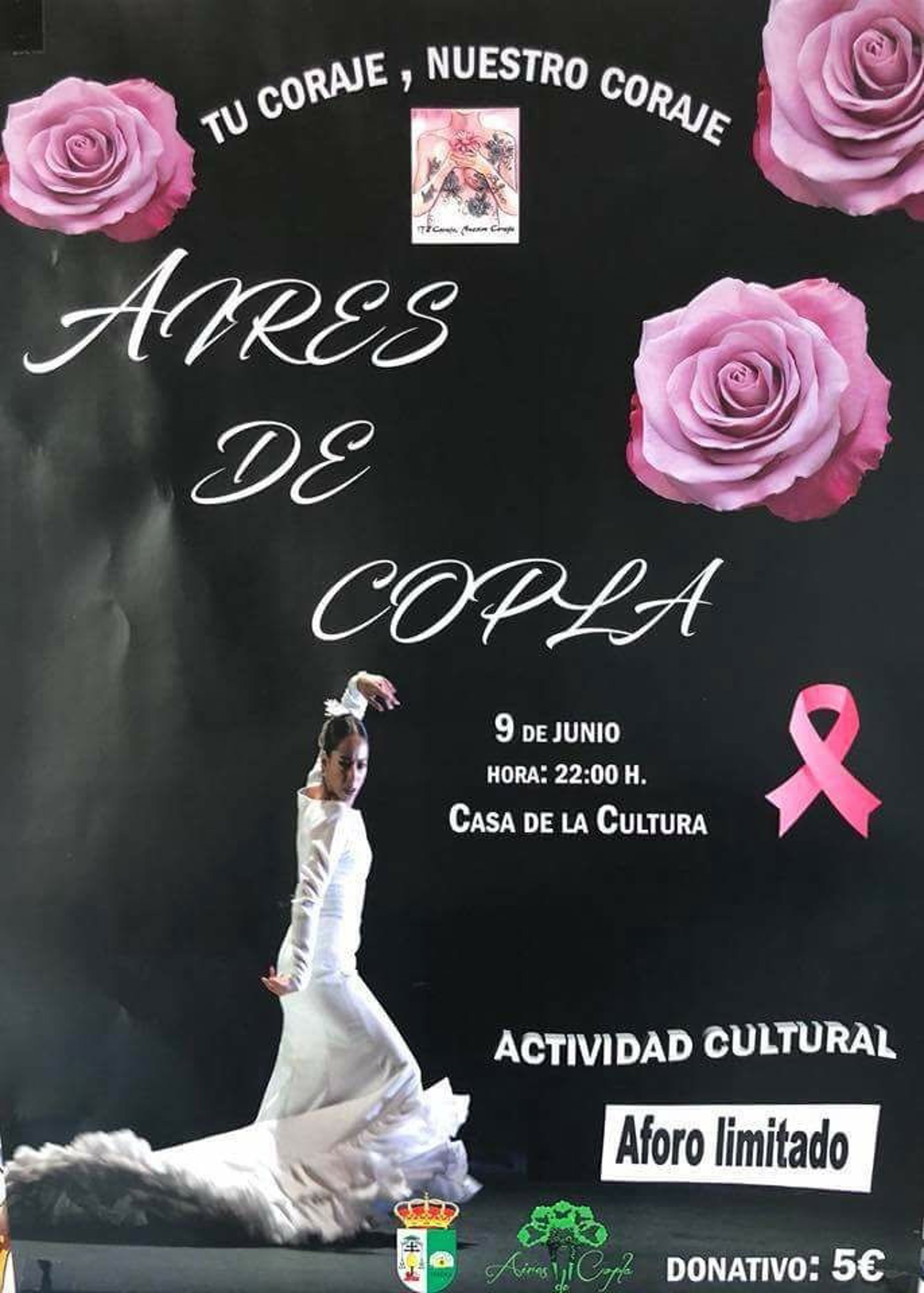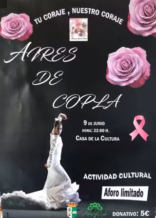 La Casa de la Cultura de Santiponce (Sevilla) acoge este sábado a las 22,00 horas un espectáculo bautizado como Aires de Copla, organizado por la Asociación 'Tu coraje, nuestro coraje', al objeto de recaudar fondos para la Asociación Española contra el Cáncer, según informa el Consistorio poncino, que colabora en la iniciativa.