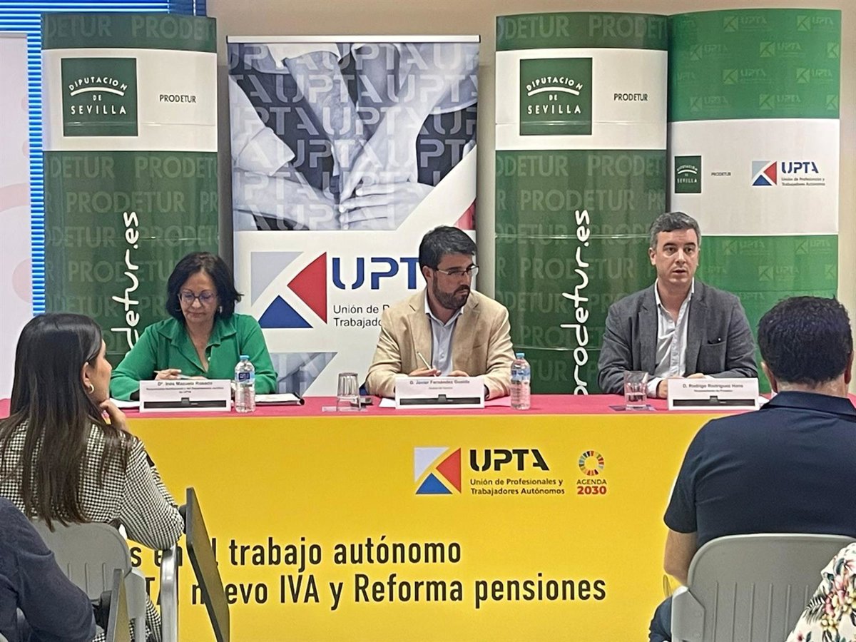 El vicepresidente de Prodetur, Rodrigo Rodríguez Hans, la secretaria general de la Unión de Profesionales y Trabajadores Autónomos de Andalucía (UPTA Andalucía), Inés Mazuela, y el alcalde de Gerena, Javier Fernández, participaron en la Jornada sobre "Las reformas en el trabajo autónomo. Nuevo RETA, nuevo IVA y reforma de las pensiones", celebrada en el municipio gerenense.